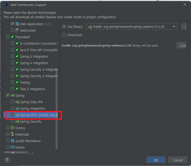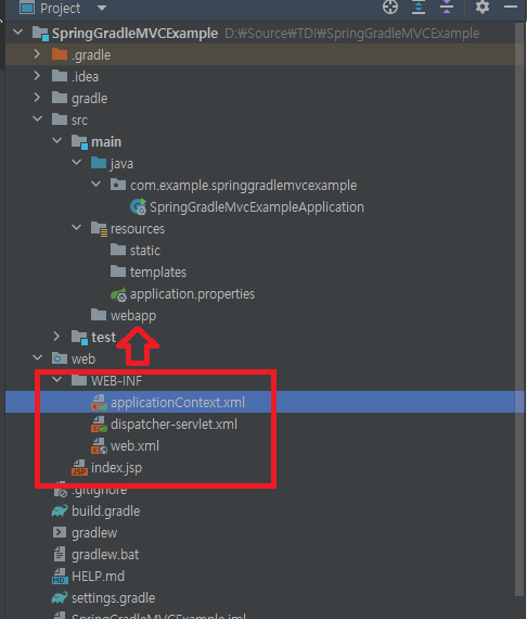Spring MVC를 추가하고 'OK'를 눌러준다. 그러면 폴더가 아래와 같이 나온다. 그러나 이 구조는 Gradle이 아닌 Java의 폴더구조라고 한다. 따라서, Gradle에서 정상적으로 빌드를 위해서는 web\아래의 경로를 main\webapp아래로 옮긴다. (webapp은 추가했음)