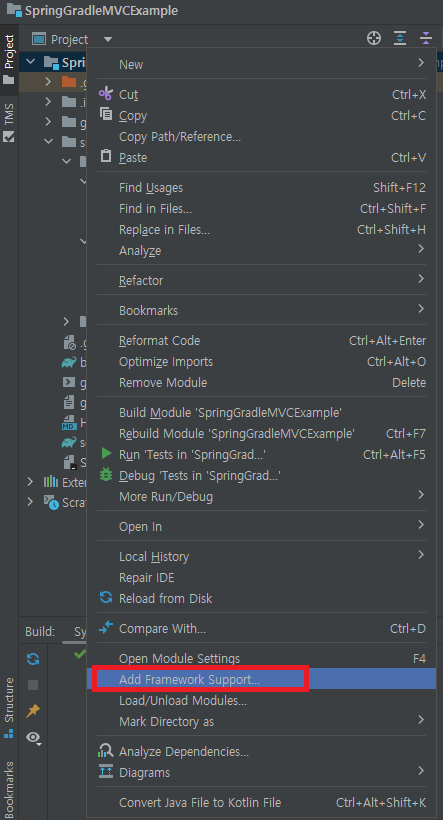 Add Framework Support를 선택하여 창을 하나 띄우고, 거기에서 Spring MVC를 추가한다.