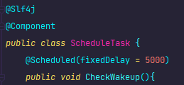 Class에는 @Component 애노테이션을, 그리고 일정 간격으로 실행 될, 메소드에는 @Scheduled 애노테이션을 붙이면 된다. 나는 테스트용으로 5초간격으로 실행시킬 것이었으므로, fixedDelay = 5000으로.