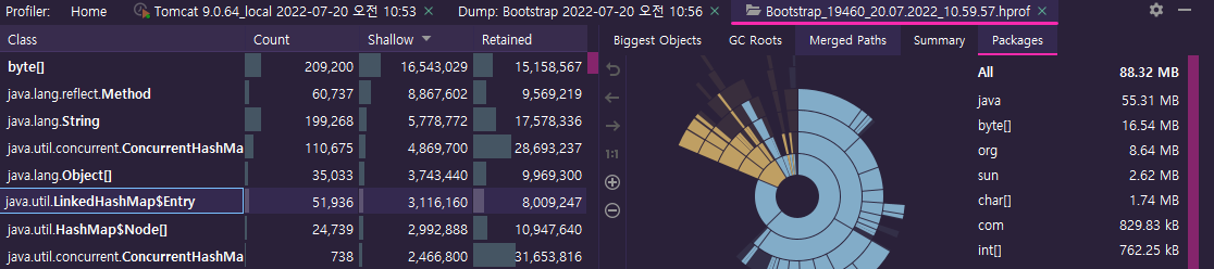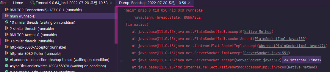 프로파일러의 내용을 확인하기 위해서는 하단 탭의 Profiler를 선택하거나