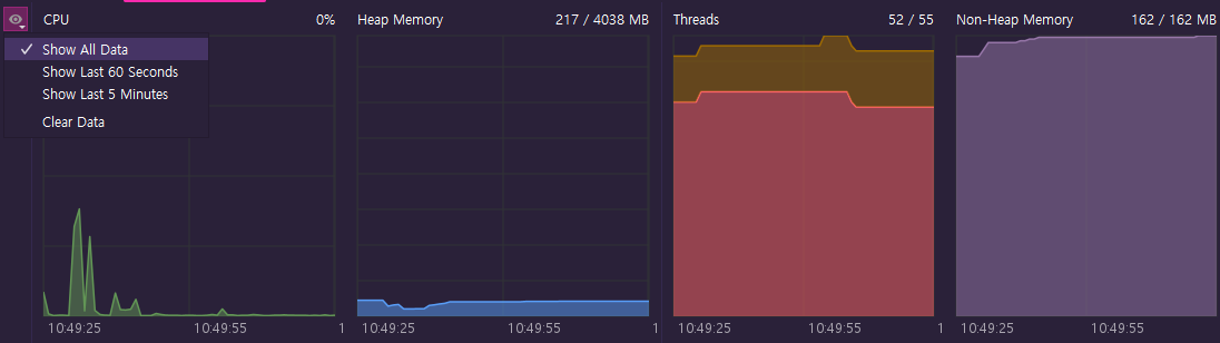 좌측의 눈 아이콘을 선택하면 프로그램 실행부터~현재까지의 데이터를 모두 표시하는 Show All Data나,