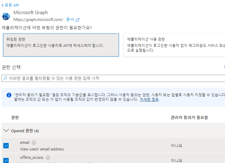 나는 메일 읽고, 캘린더 연동할 것이므로.. Graph를 선택하고, 권한은 '위임된 권한'을 선택한다.