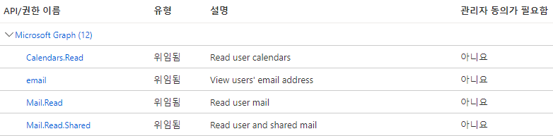 OAuth로그인 사용자 이메일 주소를 얻고싶으면 scope에 email이, Calendar를 읽어오려면 Calendars.Read 가 포함되면 된다.